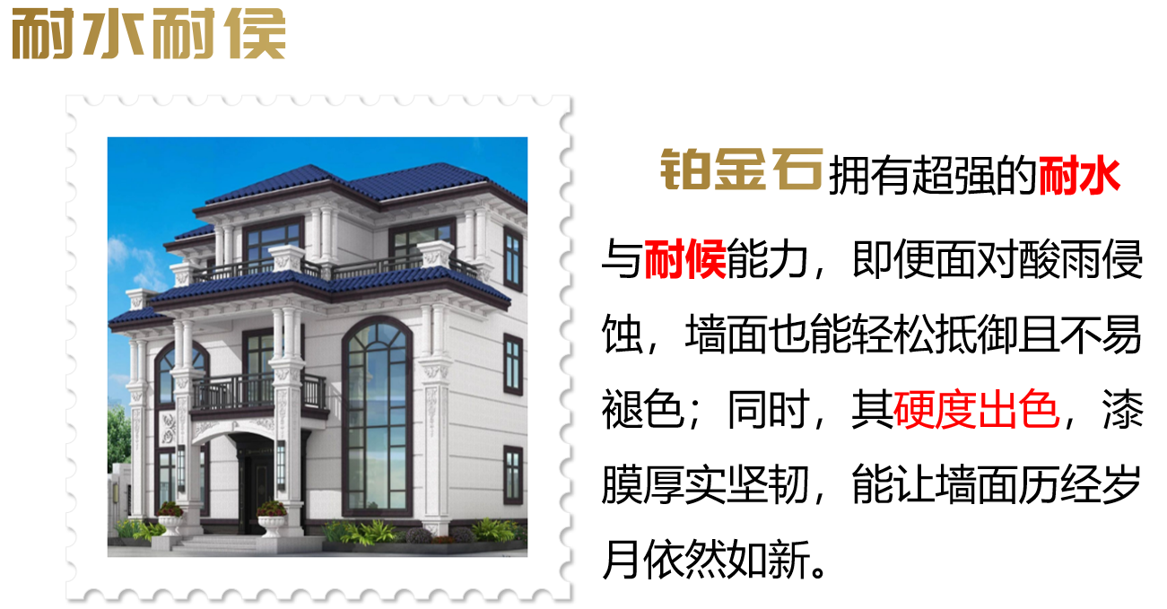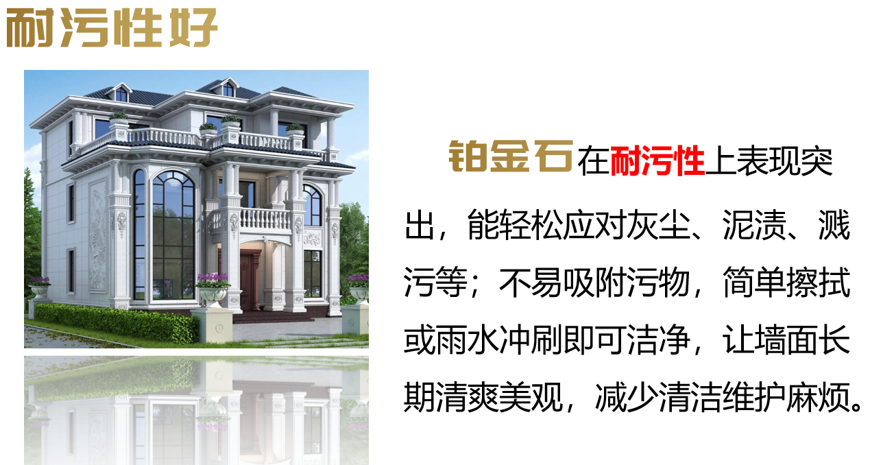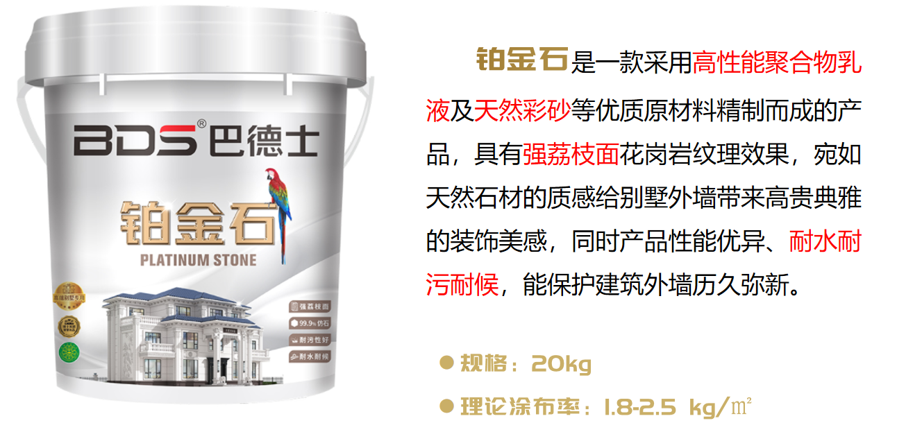 铂金石是一款采用高性能聚合物乳液及天然彩砂等优质原材料精制而成的产品,具有强荔枝面花岗岩纹理效果,宛如天然石材的质感给别墅外墙带来高贵典雅的装饰美感,同时产品性能优异、耐水耐污耐候,能保护建筑外墙历久弥新。