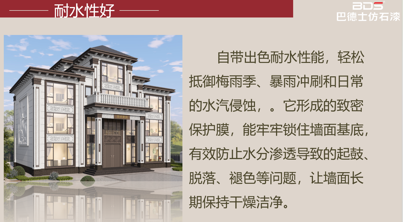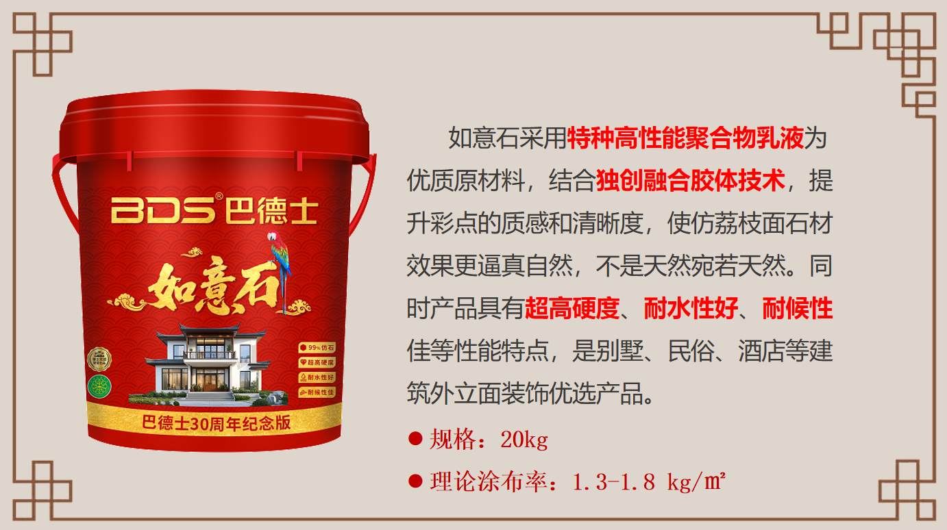 如意石采用特种高性能聚合物乳液为优质原材料,结合独创融合胶体技术,提升彩点的质感和清晰度,使仿荔枝面石材效果更逼真自然,不是天然宛若天然。同时产品具有超高硬度、耐水性好、耐候性佳等性能特点,是别墅、民俗、酒店等建筑外立面装饰优选产品。