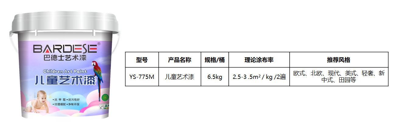 巴德士儿童艺术漆是针对儿童开发出的净味环保高性能艺术漆产品,具有净化甲醛、长效抗菌、抗污性佳的高科技全效水漆。 360°微孔净化甲醛,使其分解成水,净化室内的有害物质。采用长效抗菌配方有效抵抗细菌滋生,优异的抗污性能,高耐擦洗,
