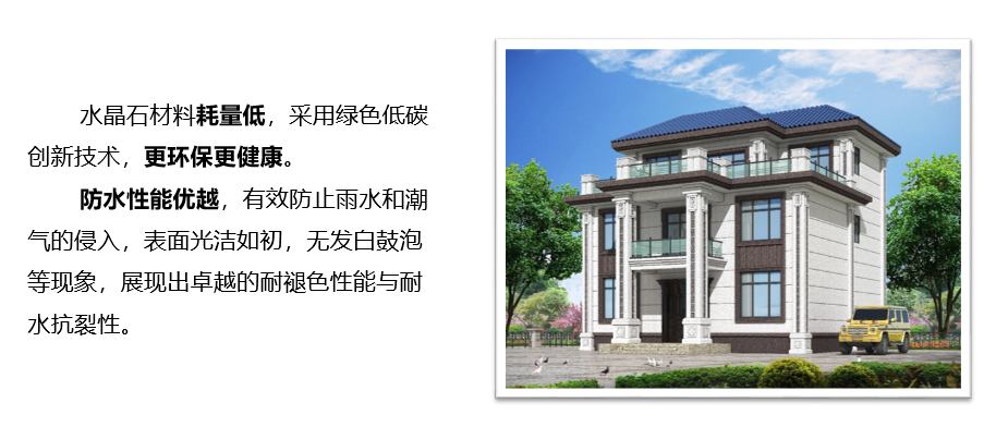 水晶石采用特种高性能聚合物乳液为优质原材料,结合独创融合和胶体技术,提升彩点的质感和清晰度,使仿荔枝面石材效果更逼真自然,不是天然宛若天然。同时产品具有超强耐水、耐候保色、用量更低等性能特点,是别墅、民宿、酒店等建筑外立面装饰优选产品。