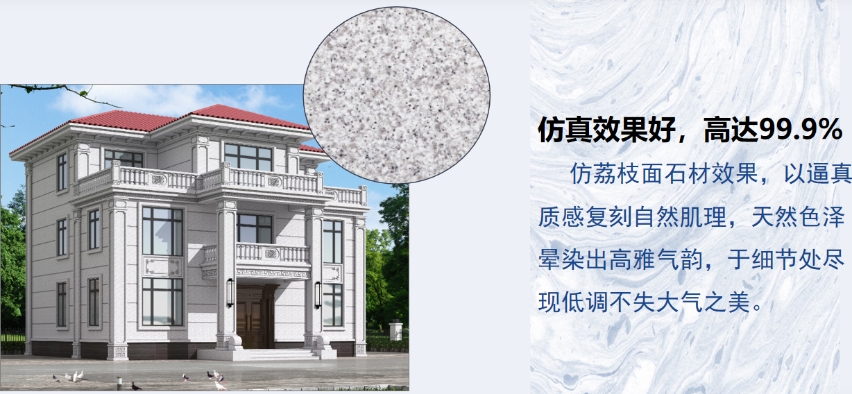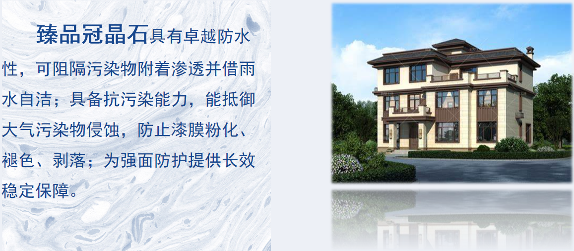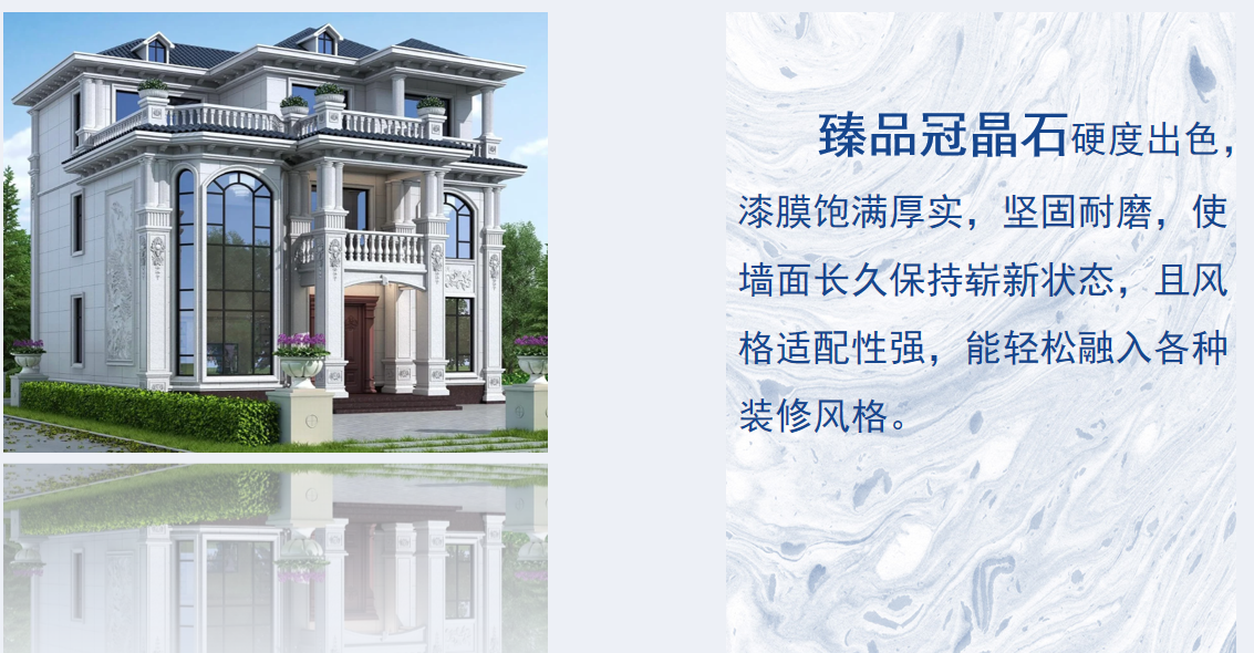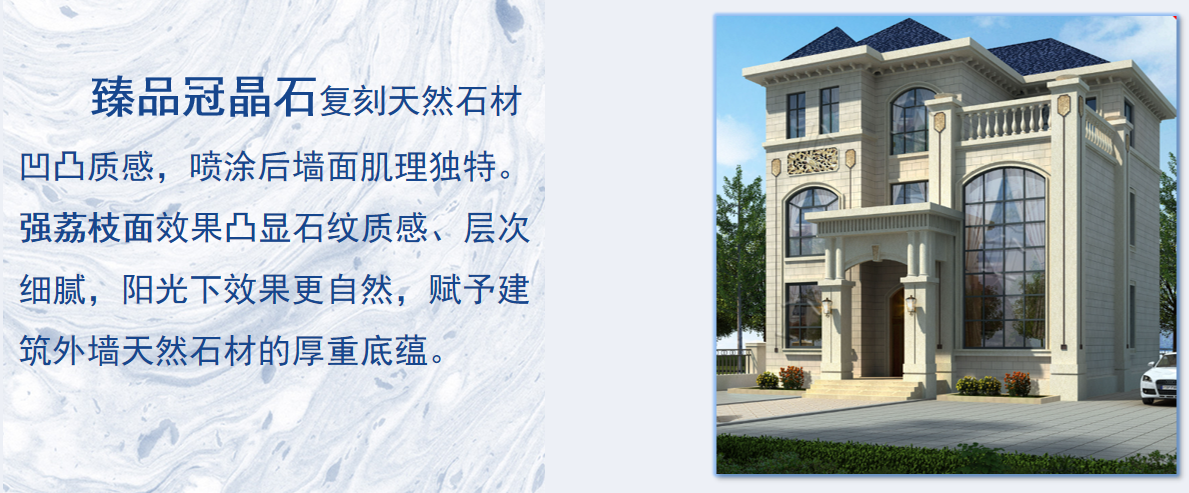 臻品冠晶石是一款采用高性能聚合物乳液,复配优质高硬度石英砂,利用独创融合和胶体技术,表面质感强烈,色泽自然,还原天然石材纹理,同时耐洗刷性能优异、耐候保色、持久耐用、施工便捷,是当代外墙的理想装饰涂料!